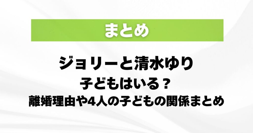 ジョリーさんと清水ゆりさんの話題では、子どものことが気になった人は多かったのではないでしょうか。 2人の間に子どもはいるのか。 話題になっている4人の子どもは誰との子どもなのか。 そこに離婚理由まで重なってくるので、少し見えにくくなっていまし... -